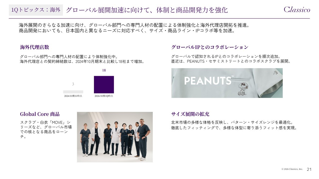 スライド左下の「Global Core 商品」では、より海外の顧客にマッチする商品ラインナップの拡充を進めています。具体的には、スクラブ・白衣の「MOVE」シリーズなど、グローバル市場で核となる定番商品を拡充するための商品をローンチしています。