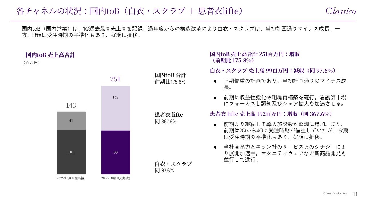 国内toBチャネルです。こちらは医療従事者向けの白衣・スクラブ、および患者向けの「lifte」の2つで構成しています。全体の売上高は2億5,100万円で、前期比175.8パーセントと大きく成長しています。