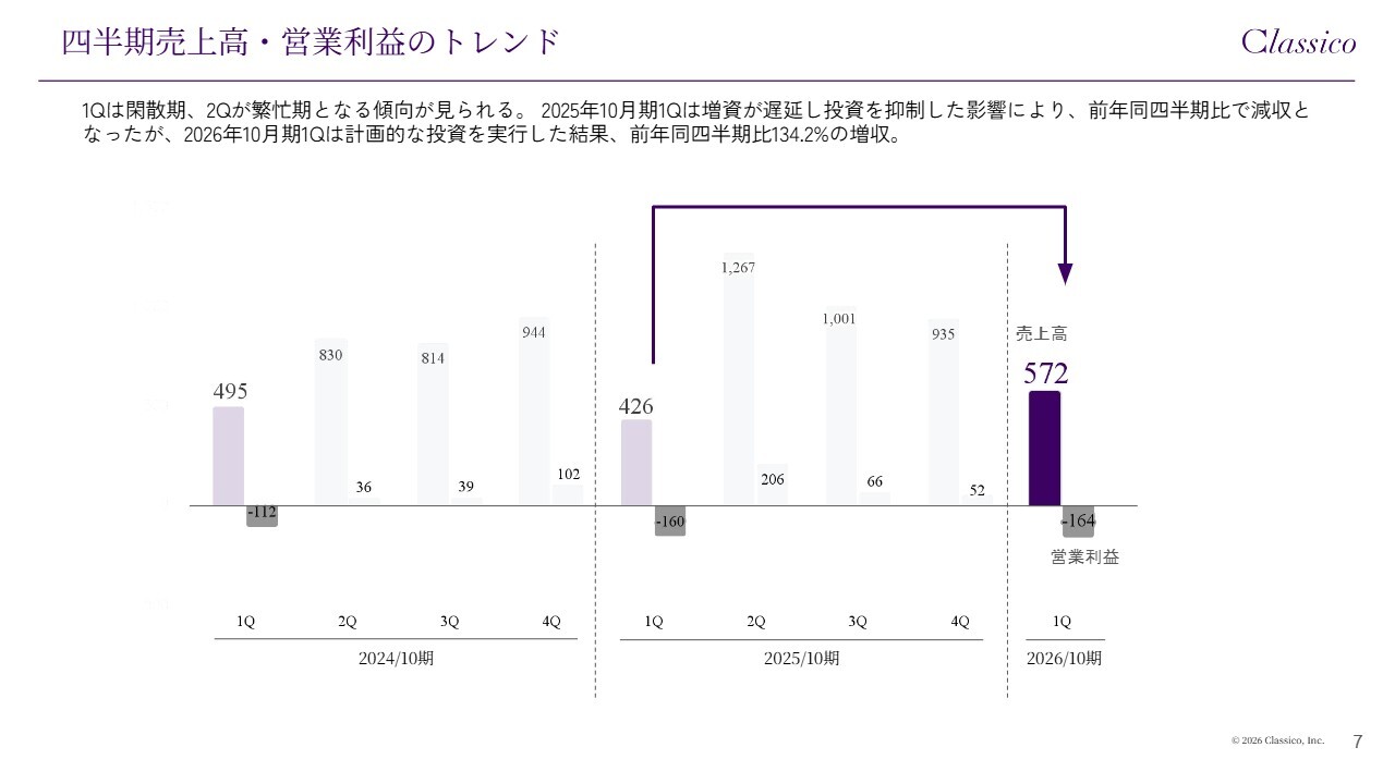 前年同期である2025年10月期第1四半期では、資本業務提携に伴う第三者割当増資が想定より遅れ、投資を抑制した結果、前年同四半期比で減収となりました。しかし、2026年10月期の第1四半期は計画的な投資を実行したことで、前年同四半期比134.2パーセントの成長を達成しています。