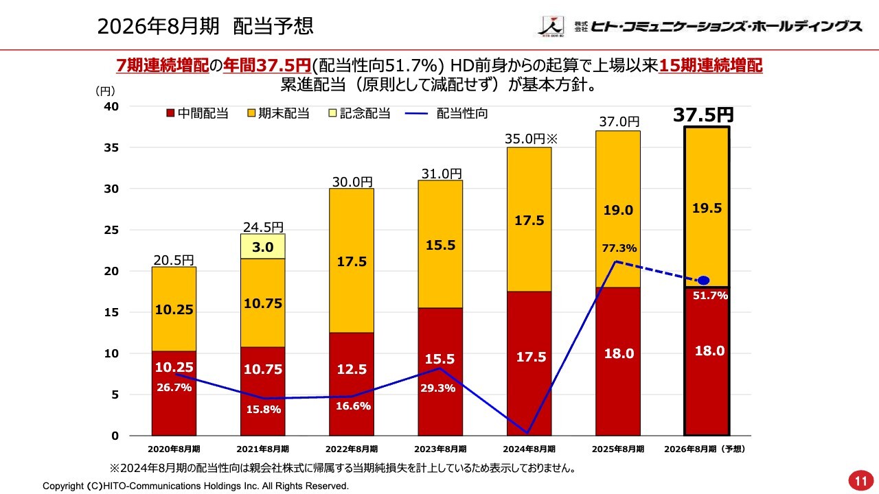 飯島:2026年8月期の配当予想についてご説明します。ホールディングス化以降、7期連続で増配を予定しています。本年の年間配当は37円50銭で、配当性向は51.7パーセントとなっています。