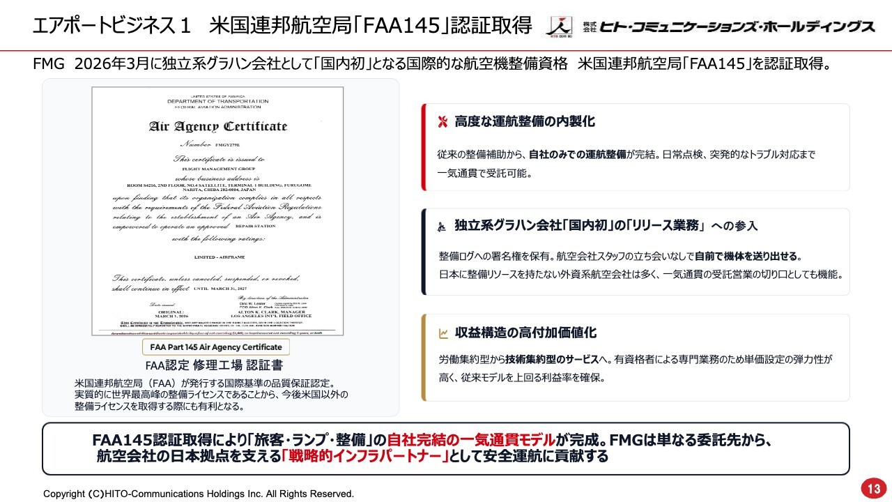 安井:当社事業の中から、今回はエアポートビジネスとIPビジネスに絞ってトピックスをお話しします。まずはエアポートビジネスです。米国連邦航空局の「FAA145」認証取得についてご説明します。