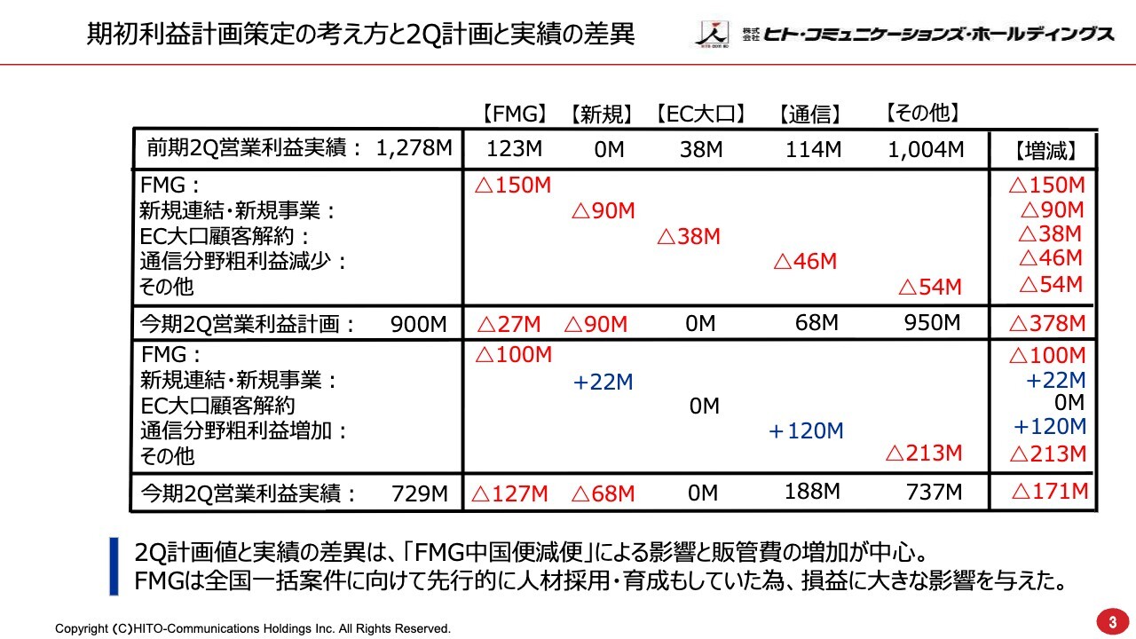 ECにおける大口顧客の解約は予定どおりで、差異はありませんでした。通信分野の期初計画は減益でしたが、コロナ禍以降の販売体制の縮小が底を打ったほか、新興キャリアの台頭などもあり、久しぶりに通信各キャリアとのマーケティング強化に取り組みました。結果として大きくプラスになり、計画を1億2,000万円上回りました。