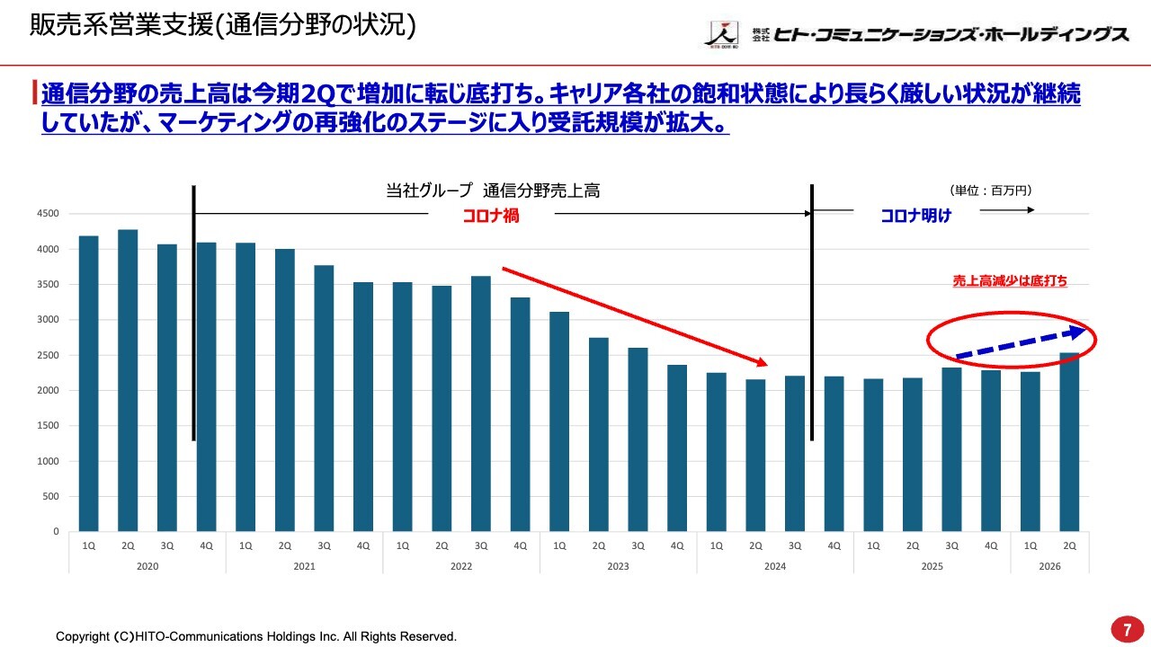 増収要因としては、大阪・関西万博の寄与が大きいスポーツ・エンタメ分野が挙げられます。また、エアポート外航の新規受託増加も順調に進捗しています。販売系営業支援では、先ほどご説明した理由により、通信キャリアの通信部門が久しぶりにカバーできるようになりました。これは大きな変化だと思います。
