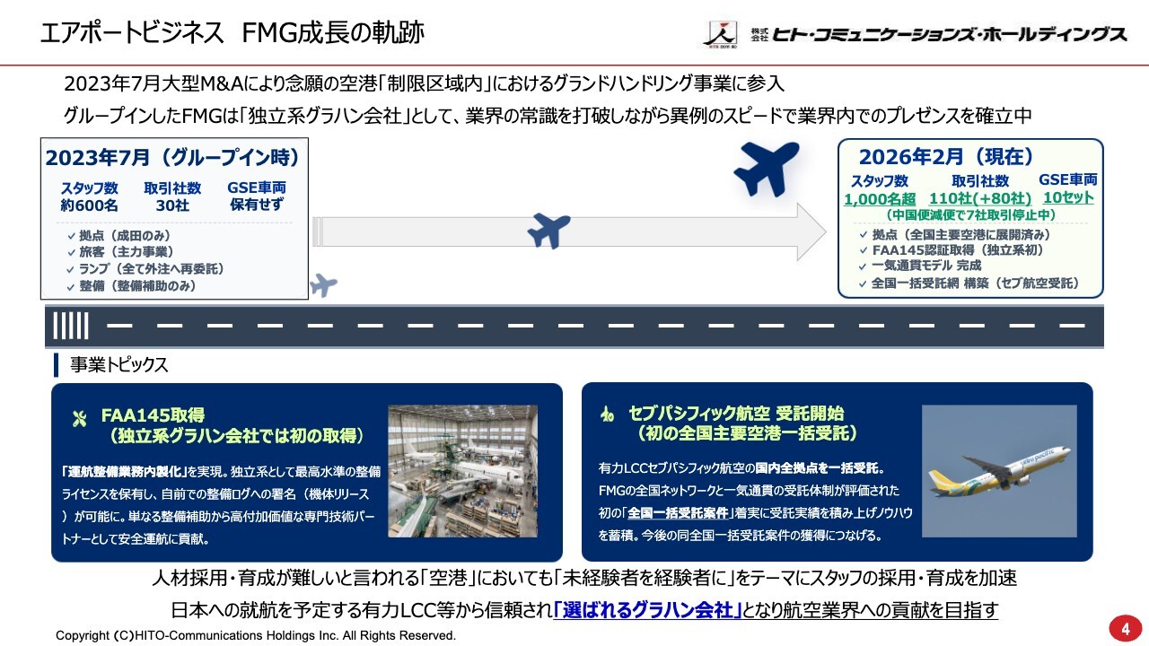 安井:エアポートビジネスにおけるFMGの成長の軌跡についてご説明します。2023年7月の大型M&Aにより、念願であった空港の制限区域内におけるグランドハンドリング事業に参入することができました。