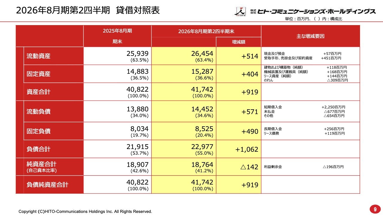福原直通氏:常務取締役CFOの福原です。私から、貸借対照表についてご説明します。スライドの表は、左側が2025年8月期末、中央が今期第2四半期の数字になります。