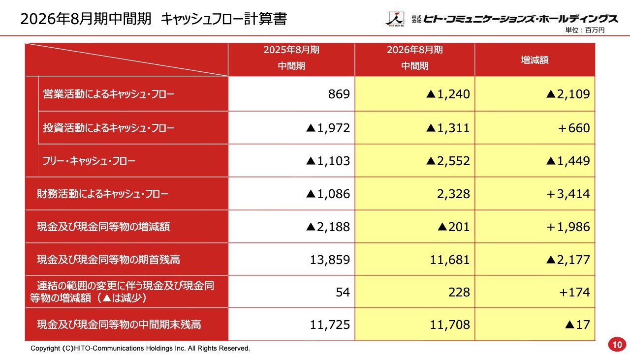 キャッシュフロー計算書についてご説明します。スライドの表は左側が2025年8月期中間期、中央は2026年8月期中間期の数字を示しています。