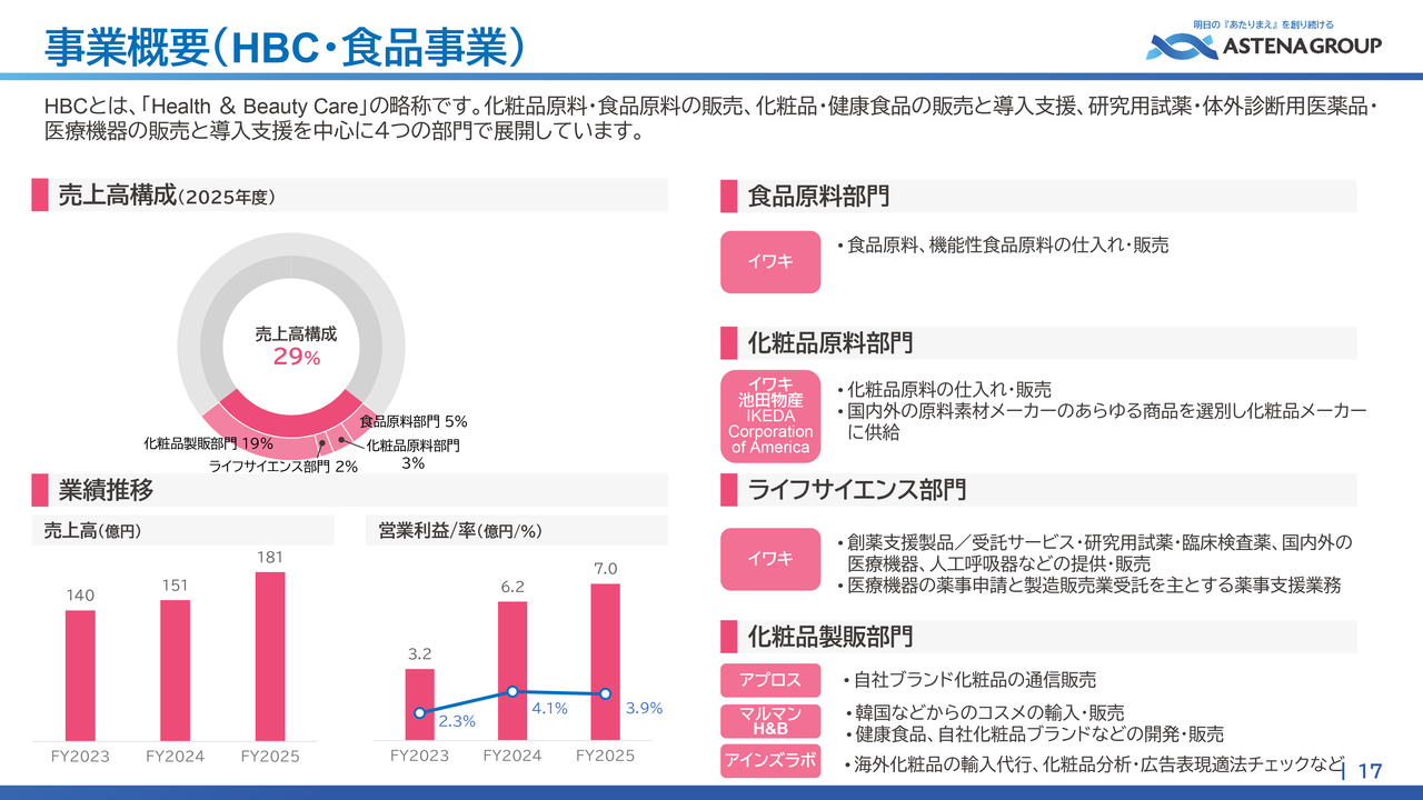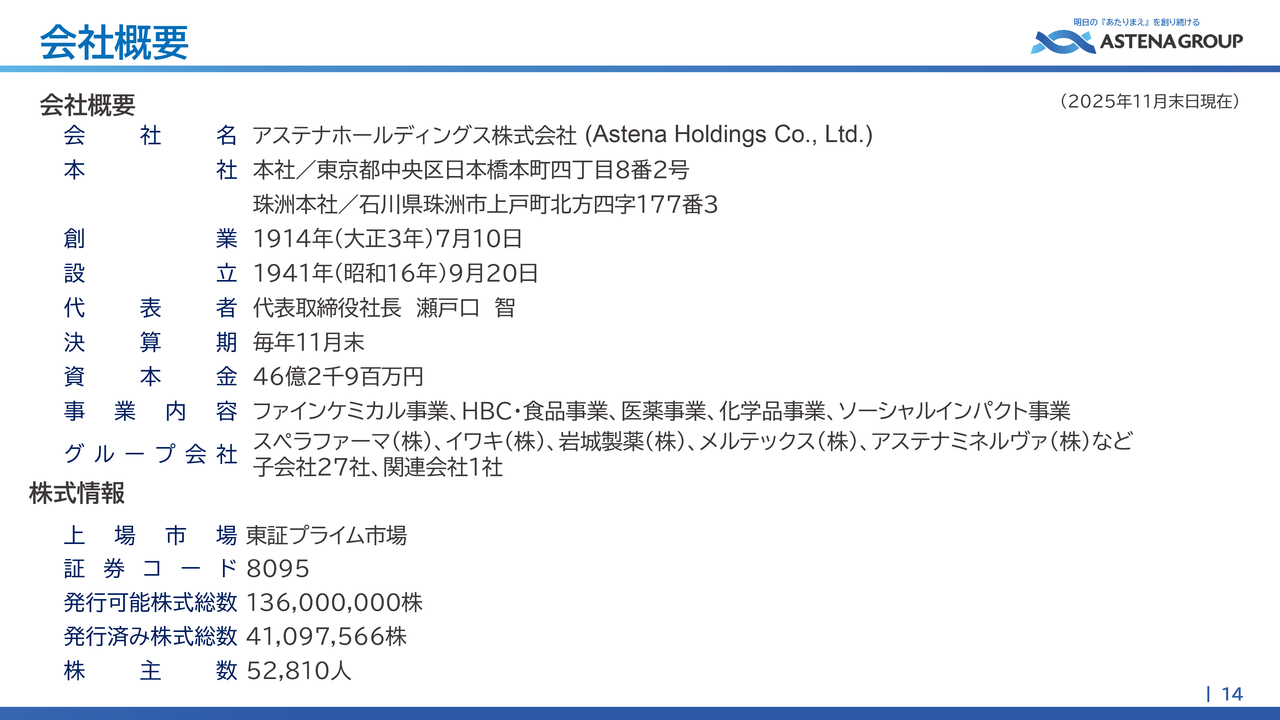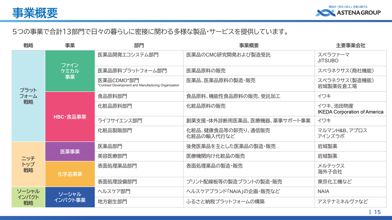 事業内容は、ファインケミカル事業、HBC・食品事業、医薬事業、化学品事業、ソーシャルインパクト事業の5つの事業を展開しています。グループ会社は、スペラファーマ株式会社、イワキ株式会社、岩城製薬株式会社、メルテックス株式会社、アステナミネルヴァ株式会社などで、子会社27社、関連会社1社を有しています。