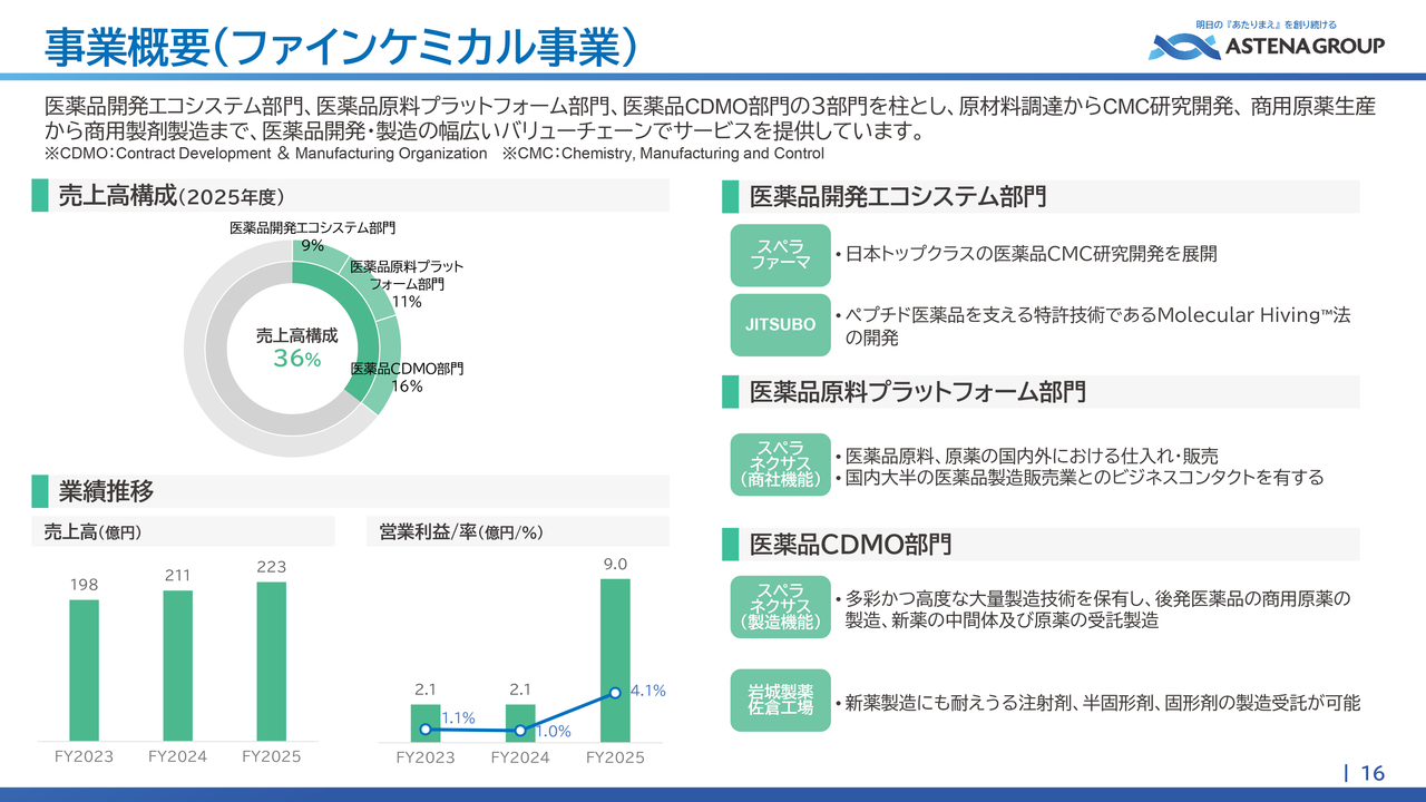 連結全体に占める売上高構成です。医薬品開発エコシステム部門は9パーセント、医薬品原料プラットフォーム部門は11パーセント、医薬品CDMO部門は16パーセントで、全体では36パーセントです。