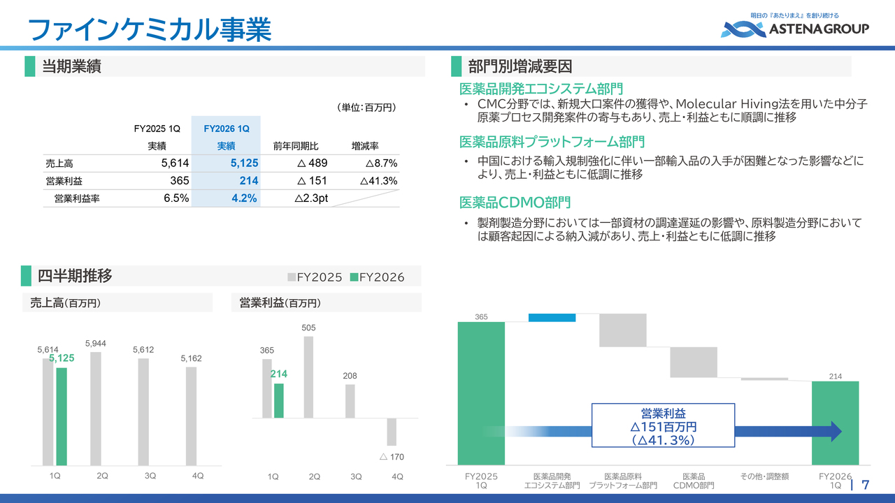 一方、医薬品原料プラットフォーム部門は、中国における輸入規制強化の影響で一部輸入品の入手が困難となり、売上・利益ともに低調でした。また、医薬品CDMO部門も、製剤製造分野の一部資材調達遅延や、原料製造分野での顧客要因による納入減の影響により、売上・利益ともに低調に推移しました。