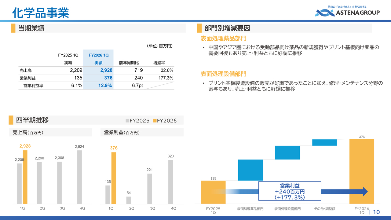 化学品事業の売上高は29億2,800万円となり、前年同期比32.6パーセント増でした。営業利益は3億7,600万円となり、前年同期比177.3パーセントの大幅な増益となりました。営業利益率は12.9パーセントとなり、前年同期比6.7ポイント上昇しました。