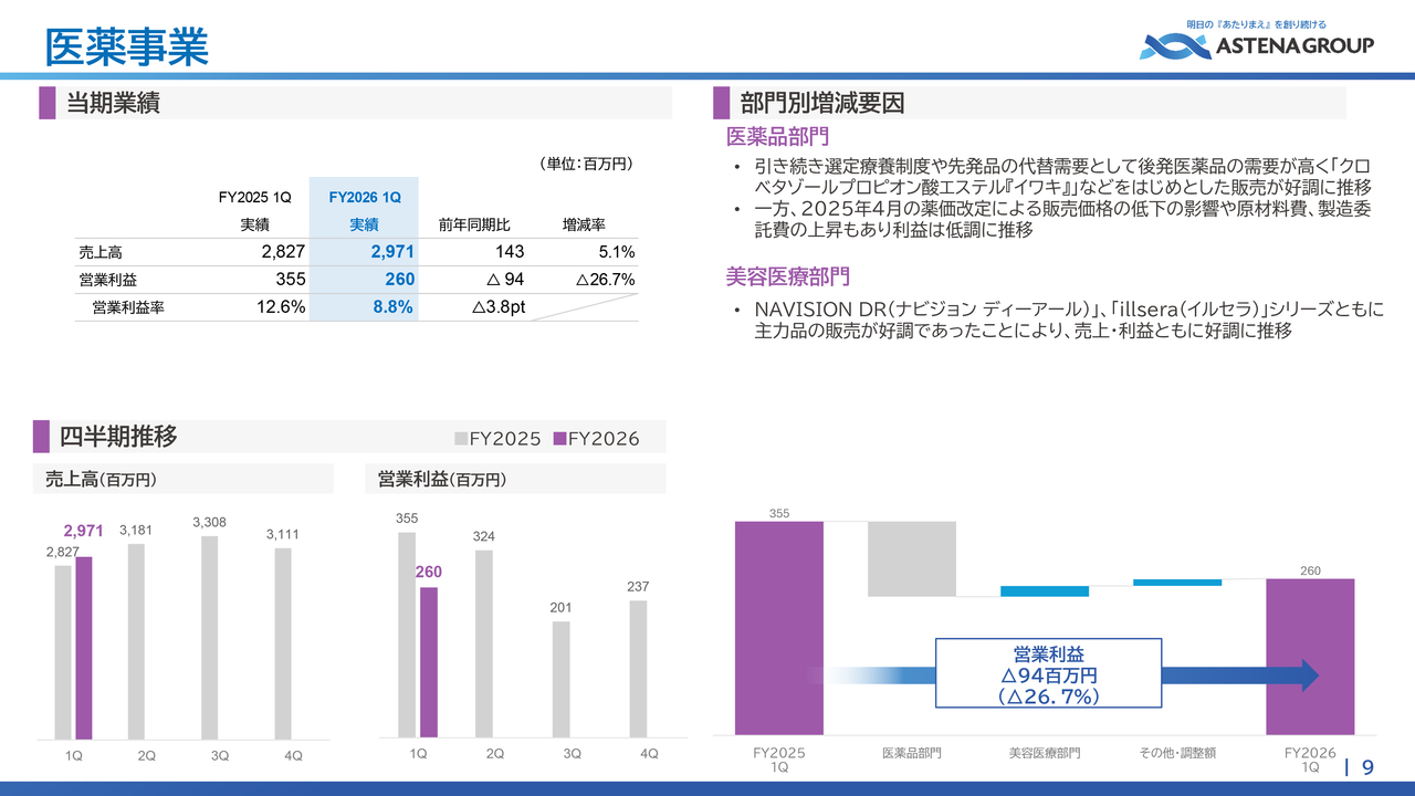 医薬品部門は、選定療養制度や先発薬代替を目的とした後発医薬品需要の高まりを背景に、「クロベタゾールプロピオン酸エステル『イワキ』」などの販売が伸長しました。一方で、2025年4月の薬価改定による販売価格の低下や、原材料費、製造委託費の上昇が利益を圧迫しました。