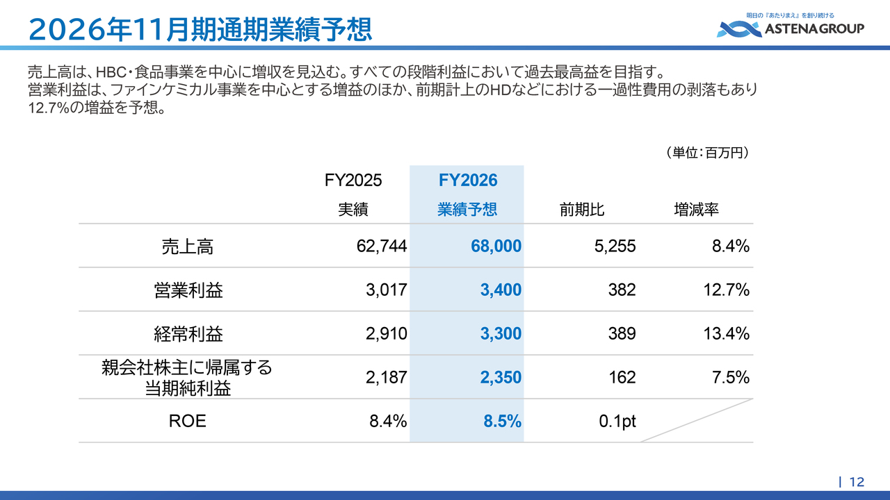 営業利益は、主にファインケミカル事業の増益に加え、アステナホールディングスで前期に計上されていた一過性費用の剥落もあり、利益が改善する見通しです。結果として、前期比12.7パーセント増益となる34億円を予想しています。