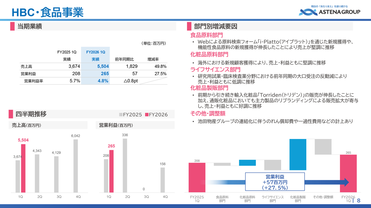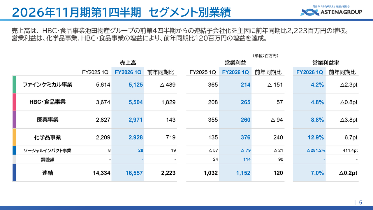 アステナHD、1Qは増収増益で通期計画に対し順調に進捗 化学品とHBC・食品事業が牽引
