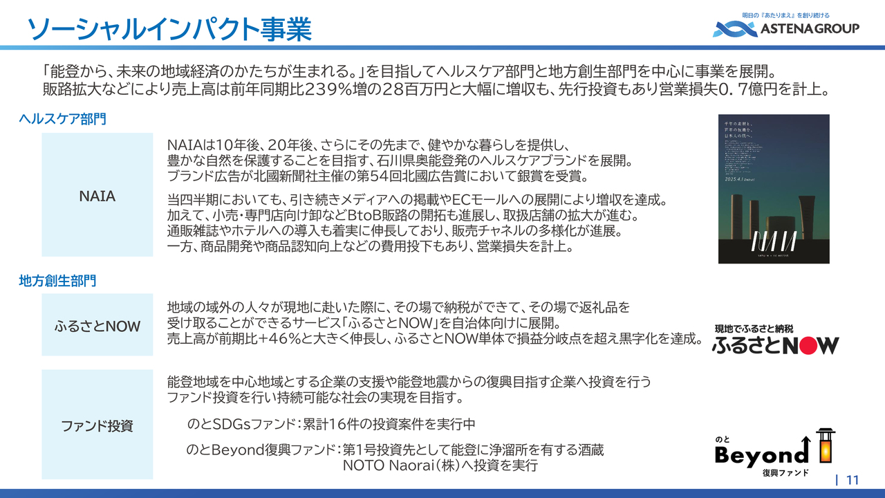 ヘルスケア部門では、石川県奥能登発のヘルスケアブランド「NAIA」を展開しています。当四半期は、メディア掲載やECモール展開に加え、小売・専門店向け卸の拡大、通販雑誌やホテルへの導入により増収となりました。一方で、商品開発や認知向上に向けた費用投下により、営業損失を計上しています。なお、同ブランドの広告は、北國新聞社主催の第54回北國広告賞で銀賞を受賞しました。