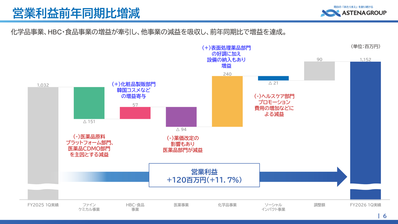 事業ごとに見ていくと、ファインケミカル事業は、医薬品原料プラットフォーム部門および医薬品CDMO部門の減益が主因です。HBC・食品事業では、化粧品製販部門における韓国コスメの増益が寄与しました。医薬事業は、薬価改定の影響により医薬品部門で減益となりました。一方、化学品事業は、表面処理薬品部門の好調に加え、設備納入も寄与して増益となりました。ソーシャルインパクト事業は、プロモーション費用の増加などにより減益しました。
