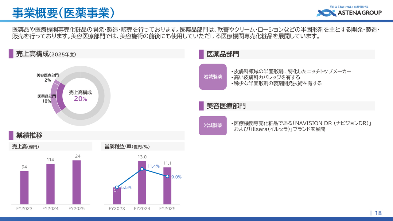 連結全体に占める売上高構成は、医薬品部門が18パーセント、美容医療部門が2パーセントで、全体では20パーセントです。
