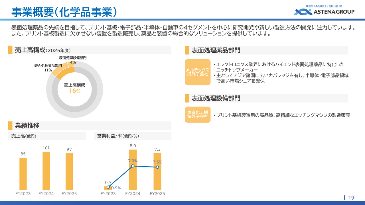 表面処理薬品部門の主要事業会社は、メルテックスとその海外子会社です。エレクトロニクス業界におけるハイエンド表面処理薬品に特化したニッチトップメーカーであり、主としてアジア諸国に広いカバレッジを有し、半導体・電子部品領域で高い市場シェアを確保しています。