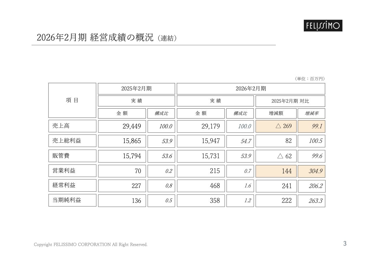 2026年2月期決算概要の経営成績についてご説明します。