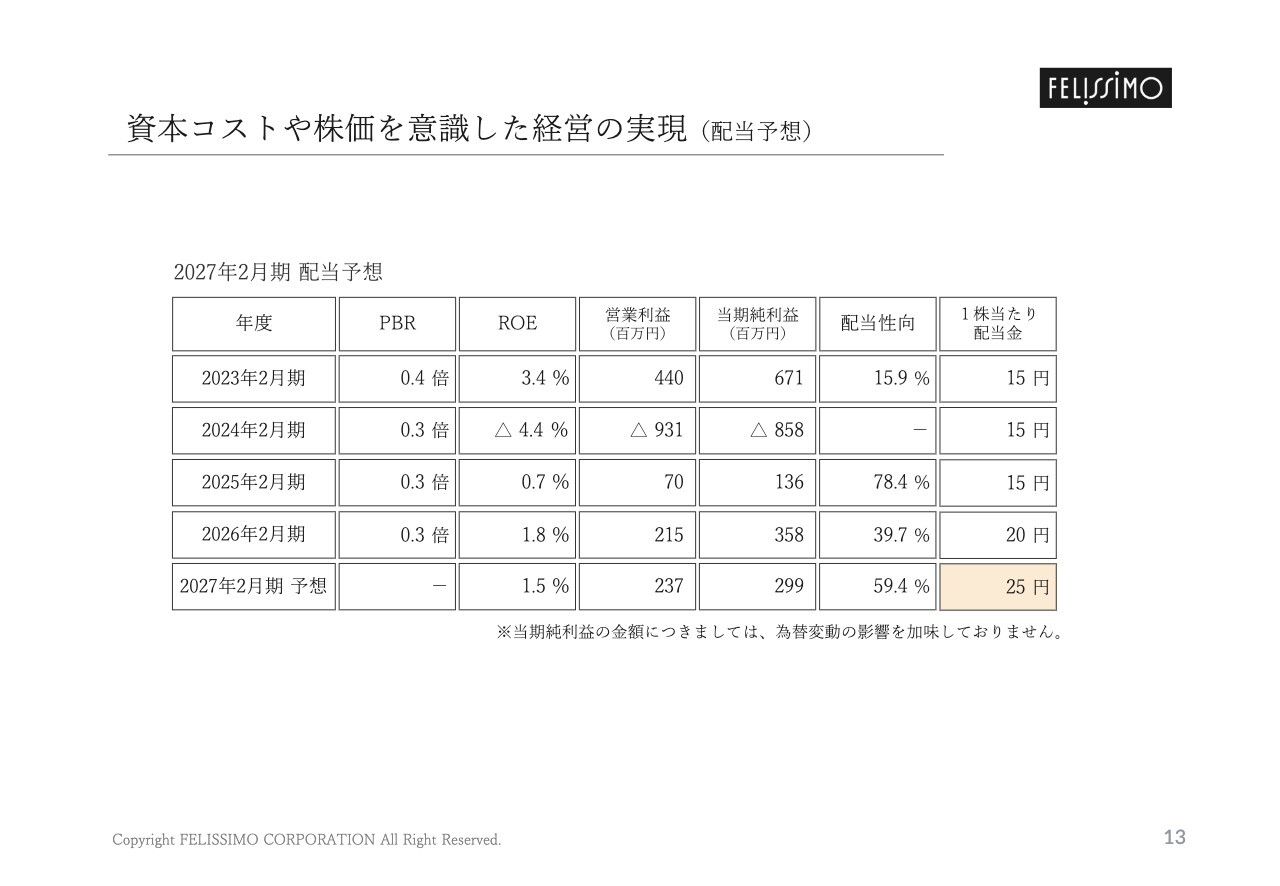 今後につきましては、PBRの改善に向けて、引き続き株主資本コストを意識したROE目標を管理指標とします。目標とするROE水準を5.0%以上とし、段階的な向上を図ります。配当については、原則として累進的配当もしくは水準を維持した安定配当を行います。2027年2月期の1株当たり配当予想は5円を増額し、25円を予定しています。