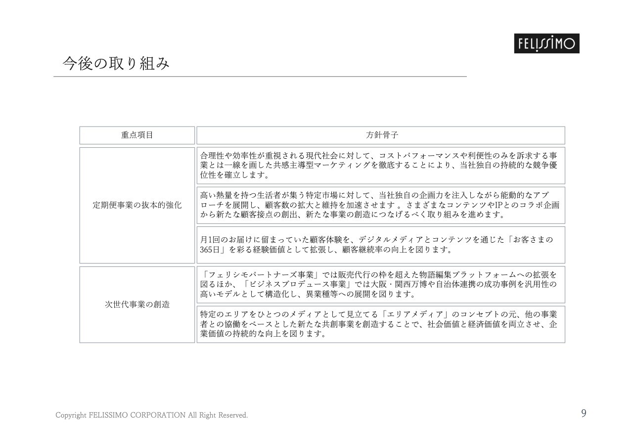 定期便事業を中心に売上拡大を図りながら、引き続き収益性を高めることにより、増収・増益を実現します。