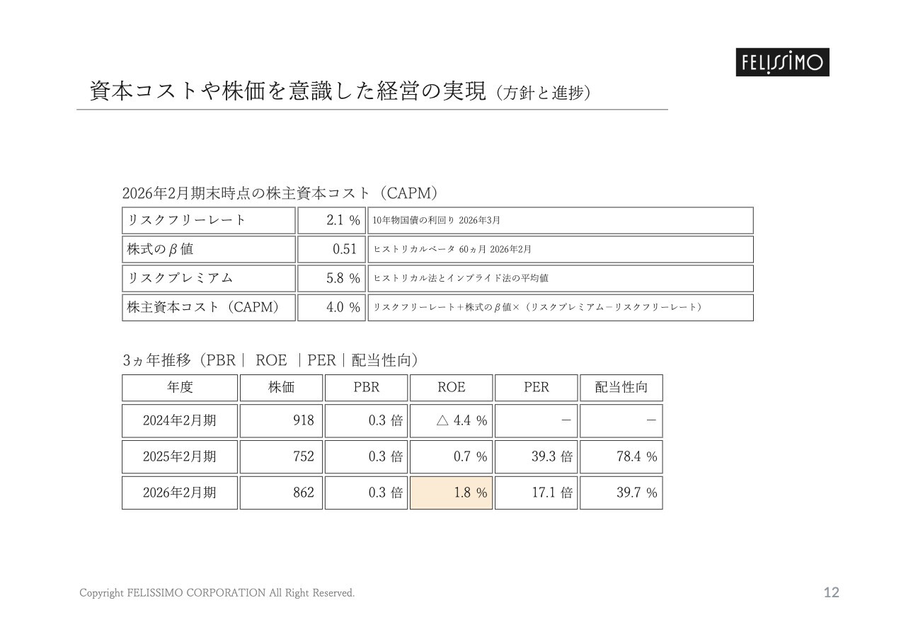 当社はPBRの改善に向けて、株主資本コストを意識したROE目標を管理指標としています。2026年2月期が増益となったことによりROEは改善しましたが、未だ株主資本コストを上回るROEを達成することができていないと認識しています。