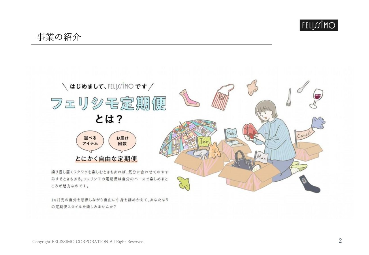 宮本孝一氏:みなさま、こんにちは。株式会社フェリシモ、経営企画室長の宮本です。本日は、当社の会社概要、2026年2月期の決算概要、および今後の取り組み、2027年2月期の業績予想についてご説明します。