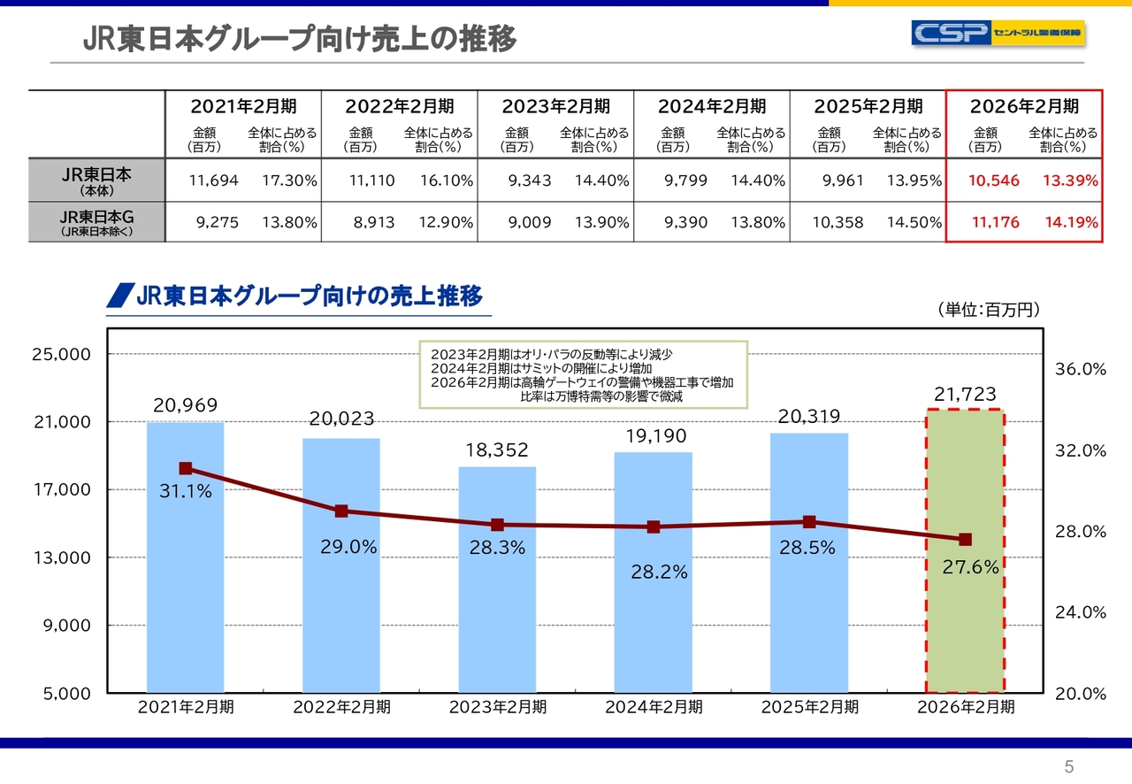 今期のJR東日本グループさま向けの売上は、スライド下のグラフにあるとおり増加しています。これは「高輪ゲートウェイシティ」の警備や機器工事による影響が大きいです。