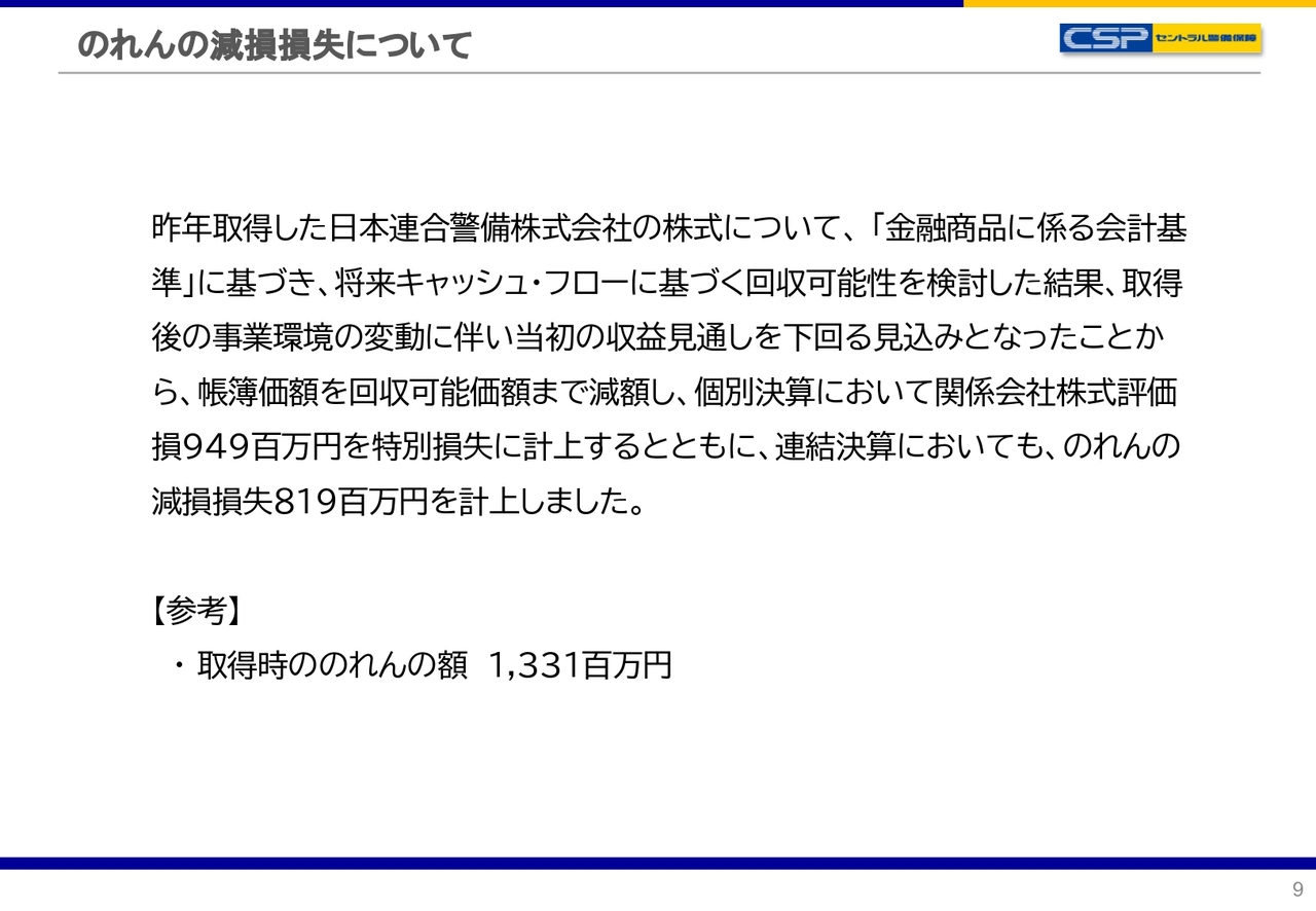昨年取得した山梨の日本連合警備株式会社の株式については、「金融商品に係る会計基準」に基づき、将来キャッシュ・フローに基づく回収可能性を検討した結果、取得後の事業環境の変動に伴い、当初の収益見通しを下回る見込みとなったことから、今回のような減損損失を計上することにしました。