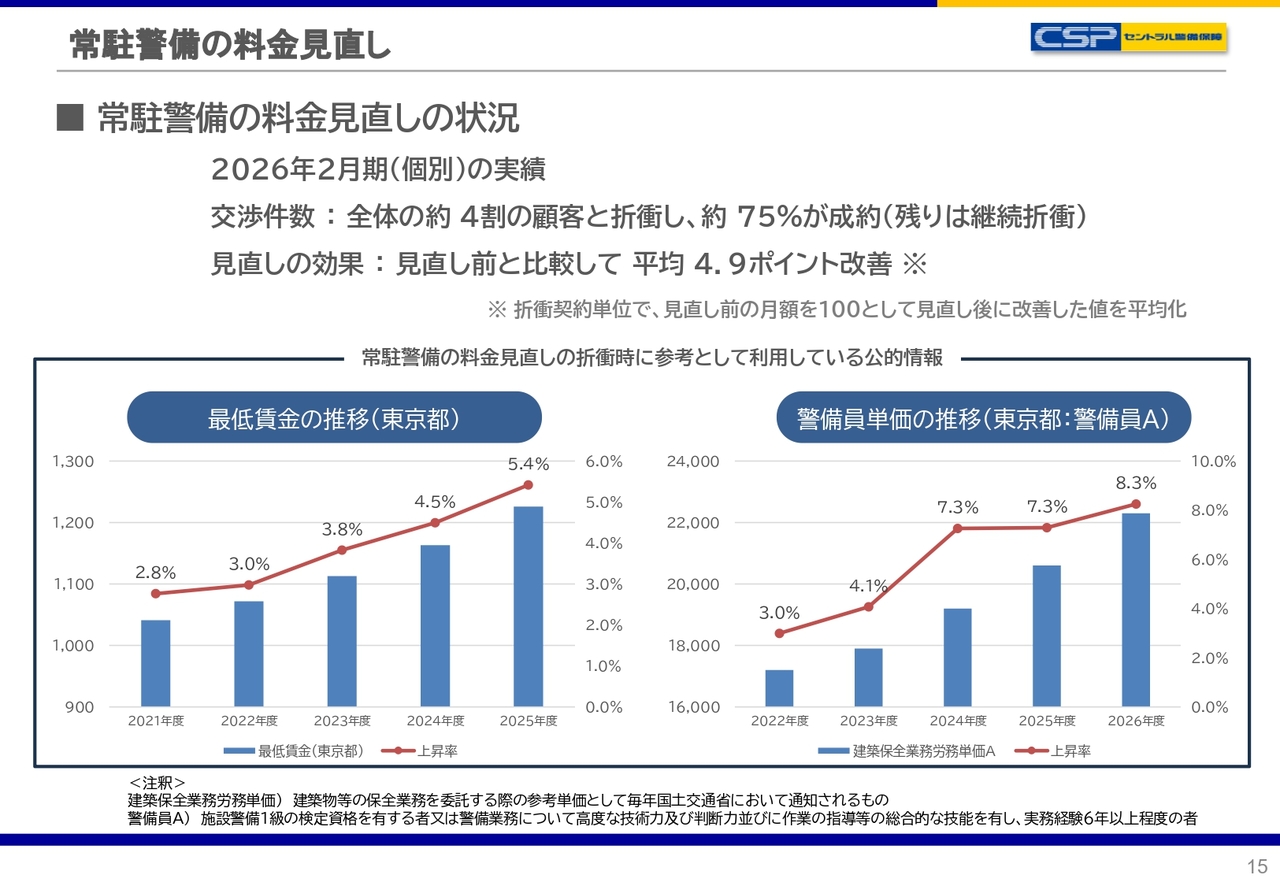 私どもは昨期、常駐警備の料金を平均4.9ポイント改善しました。この見直しについては継続して行っており、改善した数字が世の中の水準と同様になるよう、取り組みを強化していきたいと考えています。