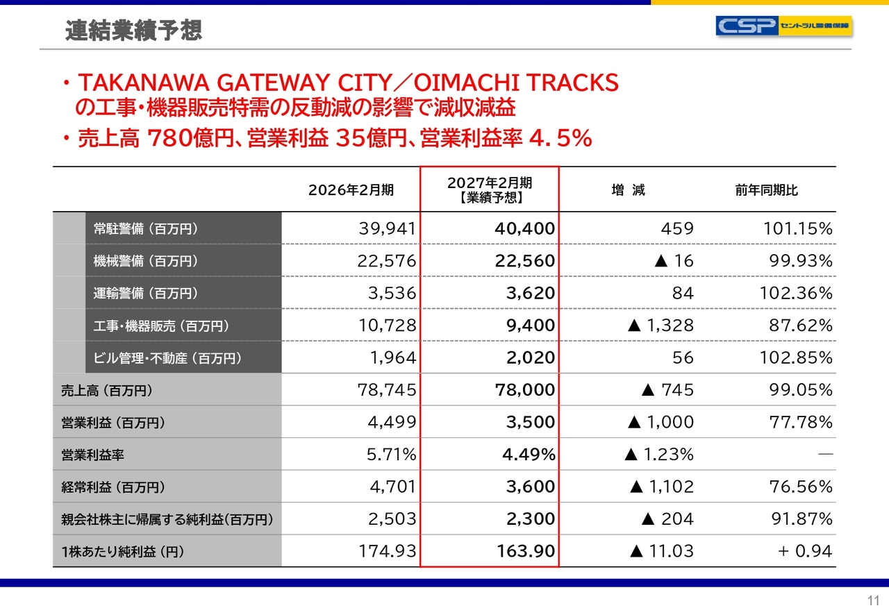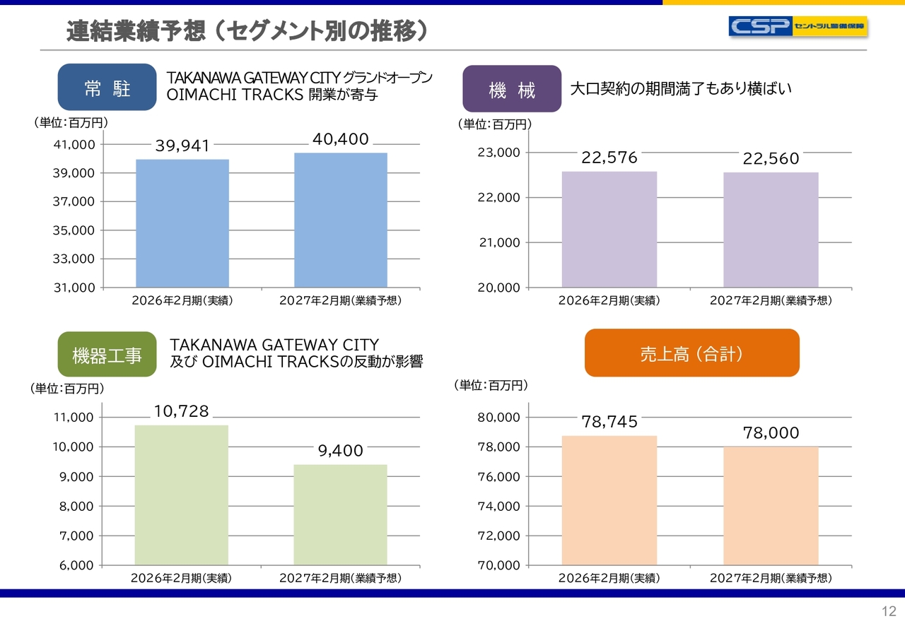 全体の売上高は微減を見込んでいます。常駐警備に関連してトータルのボリュームが少し増えることや値上げを一定程度想定していますが、一方で機器工事の反動が非常に大きいことが影響しています。
