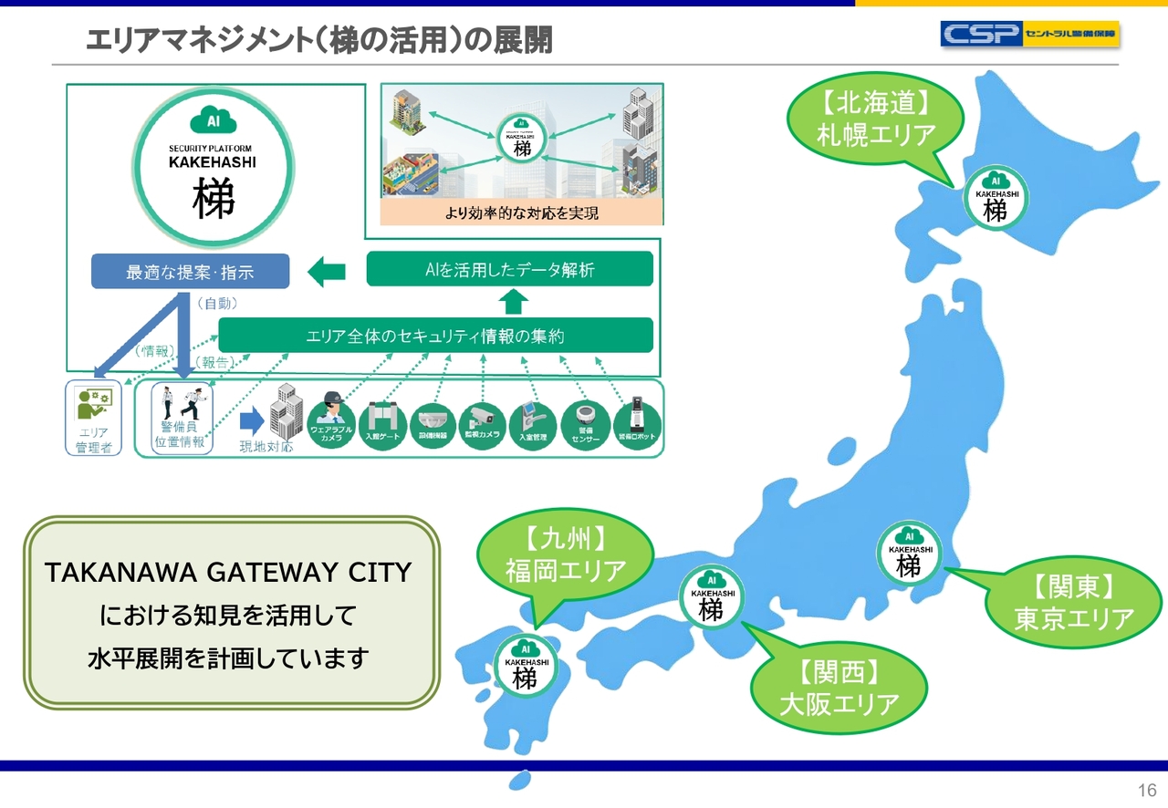 エリアマネジメント「梯(かけはし)」の活用についてです。スライド左下に記載されているとおり、「高輪ゲートウェイシティ」において「梯(かけはし)」というシステムを使用し、広いエリアを一元的に警備セキュリティの分野でマネジメントするエリアマネジメントを実装しました。