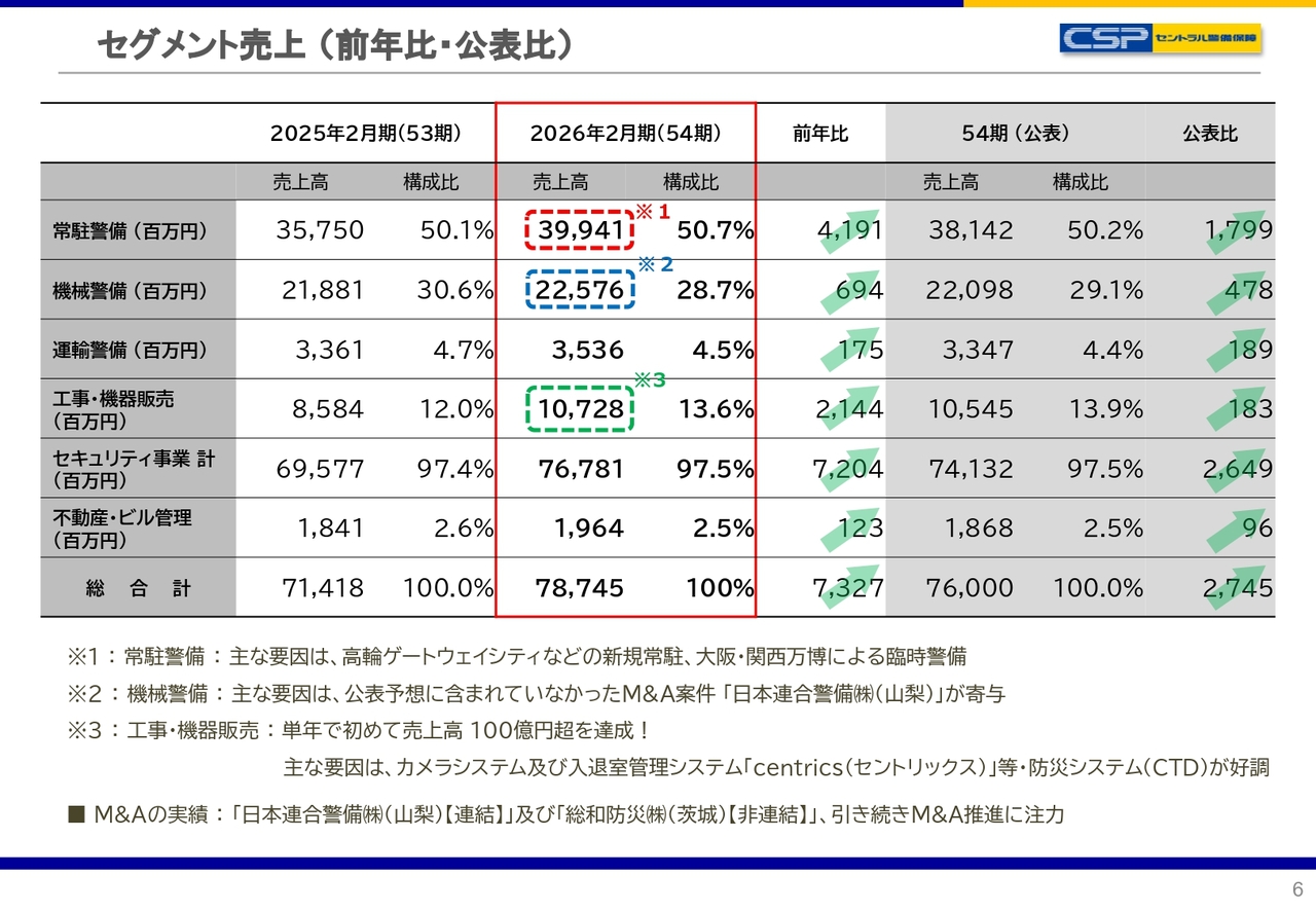 表の下に記載された米印1にあるとおり、売上高の主な増加要因は、「高輪ゲートウェイシティ」の常駐警備の開始、それに伴う機器工事が開業に向けて非常に大きな特需となったこと、日本連合警備(山梨)のM&A、大阪・関西万博の特需などです。