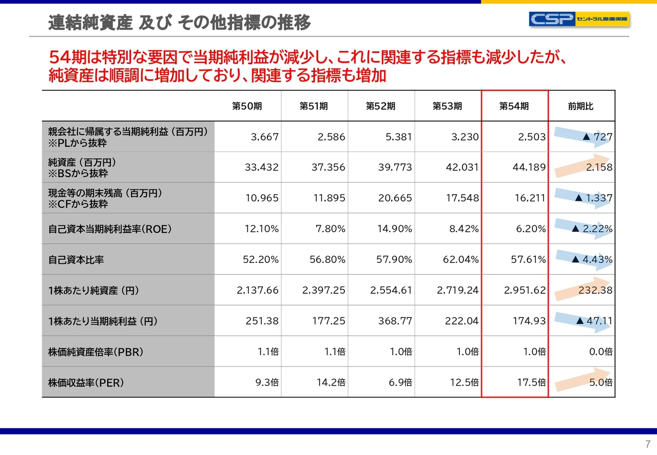 スライドでは、連結純資産とその他指標の推移を示しています。第54期は、先ほどご説明した特別な要因により当期純利益が減少しました。そのため、これに関連する指標も減少しています。ただし、純資産は順調に増加しており、それに伴い関連する指標も増加しています。