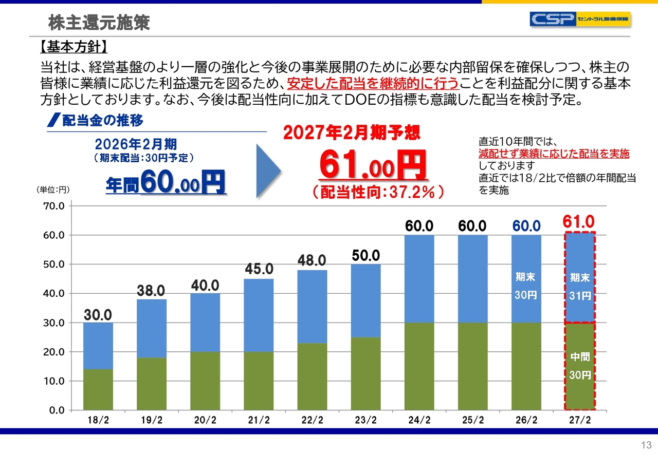 配当金についてです。2026年2月期は年間60円でしたが、2027年2月期は年間61.00円を予定し、配当性向は37.2パーセントを想定しています。