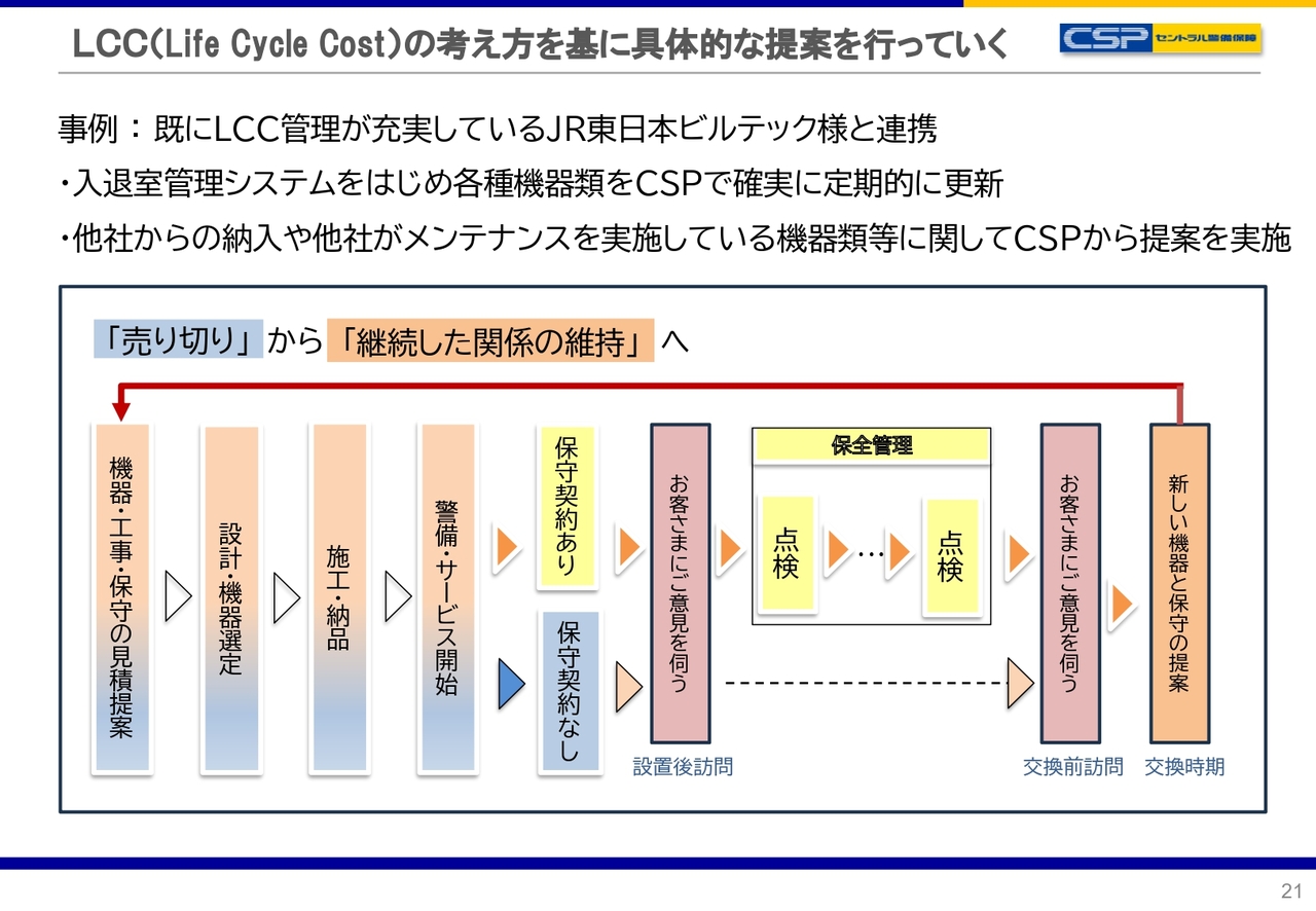 LCC(Life Cycle Cost)の考え方を基に、具体的な提案を行っていくということについてですが、このスライドには事例として「すでにLCC管理が充実しているJR東日本ビルテックさまと連携」とあります。
