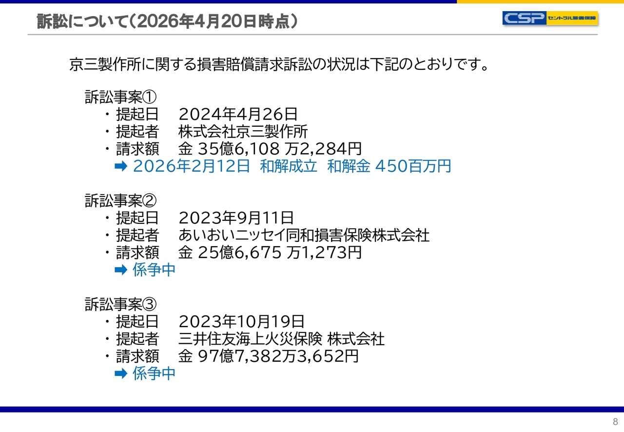 このほか、保険会社さまからも同様の関係で訴訟を提起されている状況です。これら2件については係争中のため、内容についてのコメントは控えます。現状は、スライドのとおりです。(【補足追記】資料中の記載はありませんが、決算説明会の翌日(4月21日)あいおい損保との和解が成立しております。(和解金4億円))
