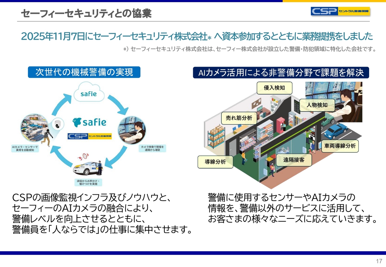 セーフィーセキュリティさまとの協業についてです。すでにご案内のとおり、2025年11月7日にセーフィーセキュリティ株式会社さまへ資本参加するとともに、業務提携を行いました。