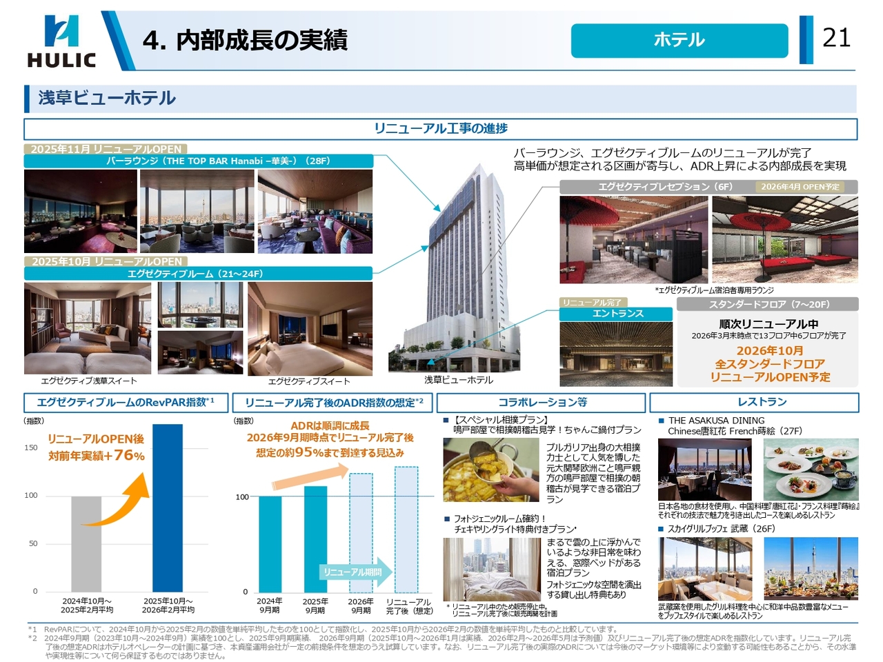 今後もインバウンドの増加に伴うホテル賃料の成長を一定程度想定しつつ、浅草のリニューアル完了によるADRや稼働率の改善効果も見込むところです。