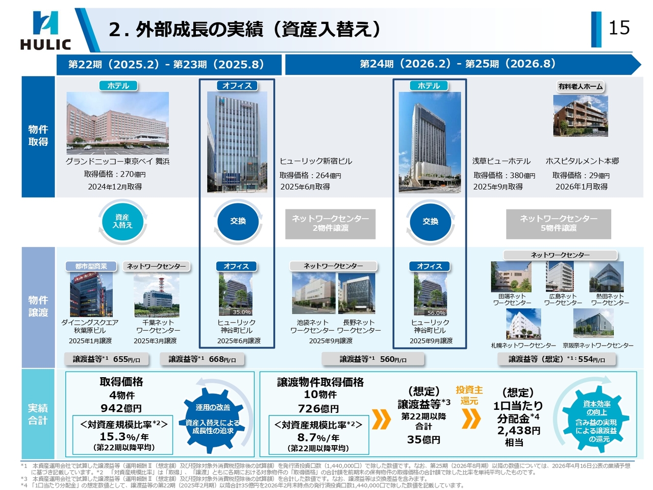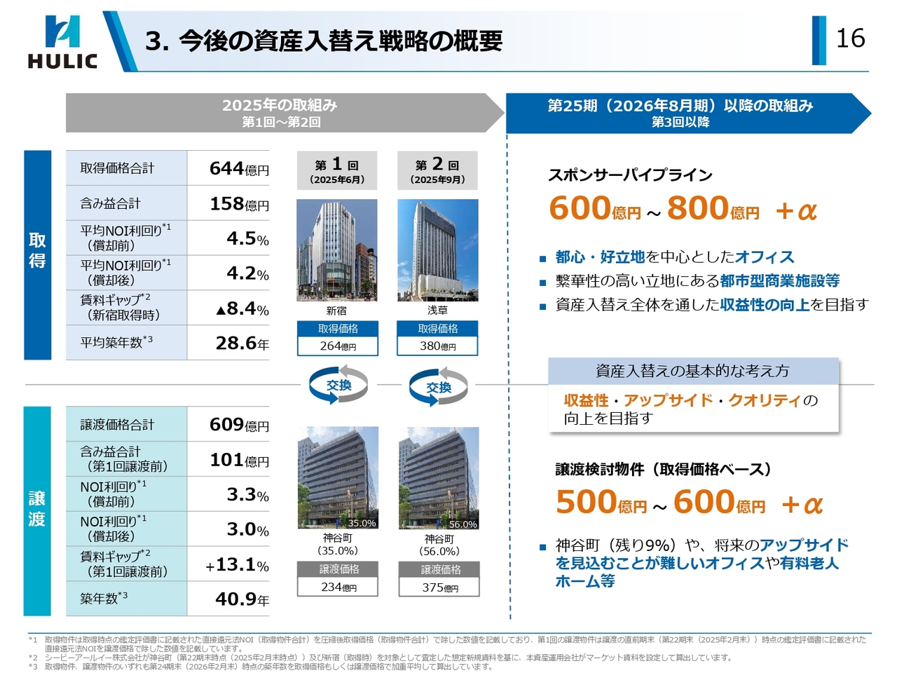 2025年は資料左の2回の交換取引を実施しましたが、今期以降の取り組みとしては、引き続き500億円から600億円規模の物件を譲渡しながら、財務レバレッジも活用し、600億円から800億円規模の物件に入れ替えていく方針です。