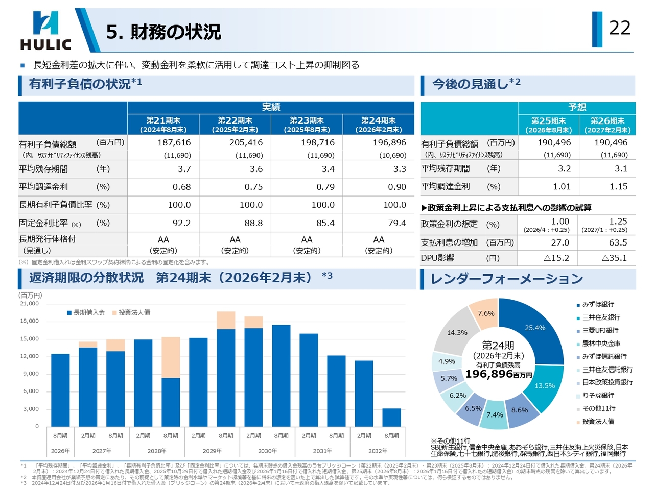 続いて、22ページは財務の状況です。第24期は、昨年12月の政策金利引き上げ後、長期金利が高止まりしたことから、変動金利での借換え比率を高めています。長短金利差が拡大しており、今後の政策金利の引き上げを想定しても、現状、固定金利での借換えは必ずしも得策ではないとの判断によるものです。