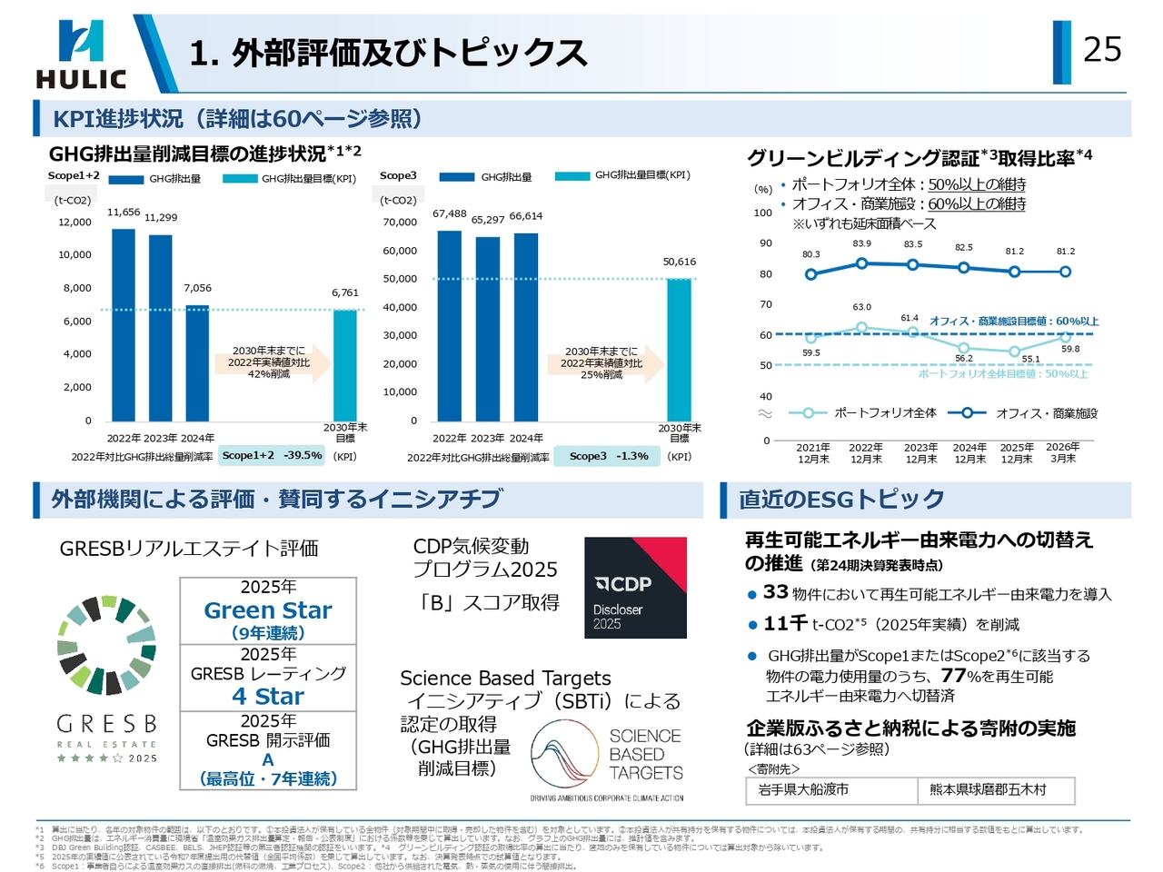 25ページはESG対応についてです。KPIの進捗状況について、GHG排出量の削減はScope1プラス2で2030年末削減目標42パーセントに対し、39.5パーセントまで順調に進捗しています。