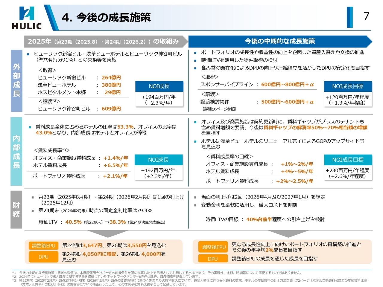 一寸木:これからの中期的な取組みについては7ページにまとめています。NOI成長率の目標自体はこれまで掲げてきた目標の年平均3パーセントを踏襲していますが、実際の取組みとしては7ページの右側に記載のとおりであり、外部成長と内部成長のNOI成長目標を足し合わせると1年あたりプラス3.9パーセントとなります。