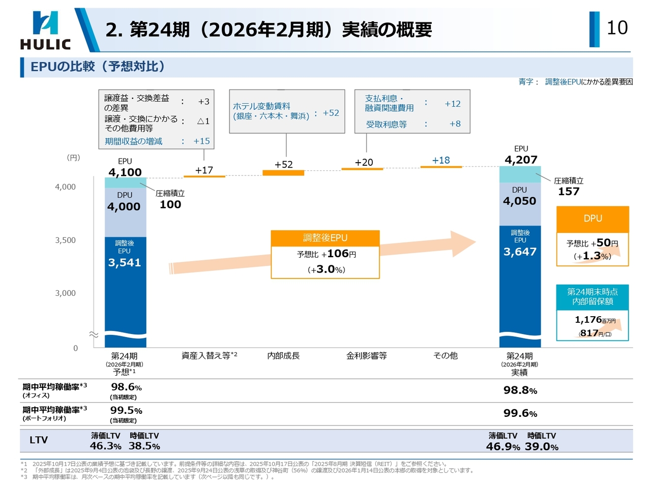 まず第24期実績ですが、資産入替えに伴う期間収益やホテル変動賃料の上振れ、金利要因等で、調整後EPUは予想を106円上回りましたので、DPUを4,050円に増配しました。