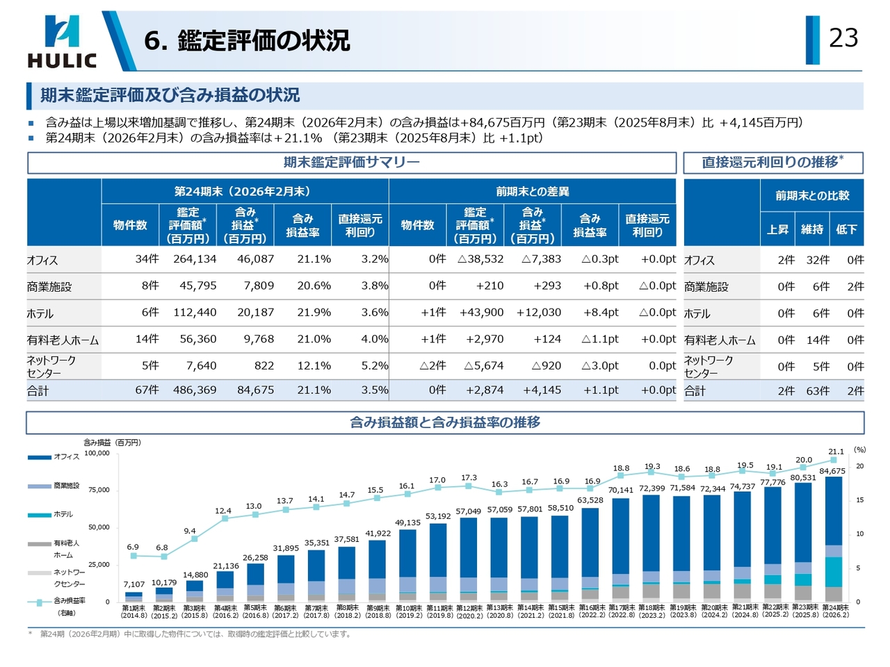 23ページの鑑定評価については、ポートフォリオの含み益は前期比41億円増加し847億円弱となりました。