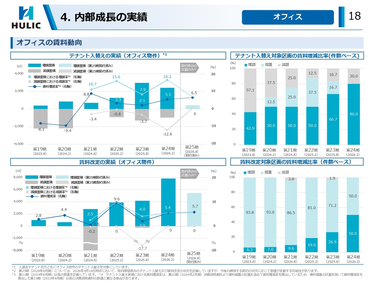 一寸木:ご指摘のとおり、賃料の増額率については大きく加速しているという状況ではないですが、18ページの右下に記載している賃料改定対象区画の賃料増額比率は、第24期(2026年2月期)に50.0パーセントとなっていますが、第25期(2026年8月期)は始まってまだ2ヶ月程度しか経っていませんが、従来と比較するとかなり順調に進捗しているという印象を受けています。