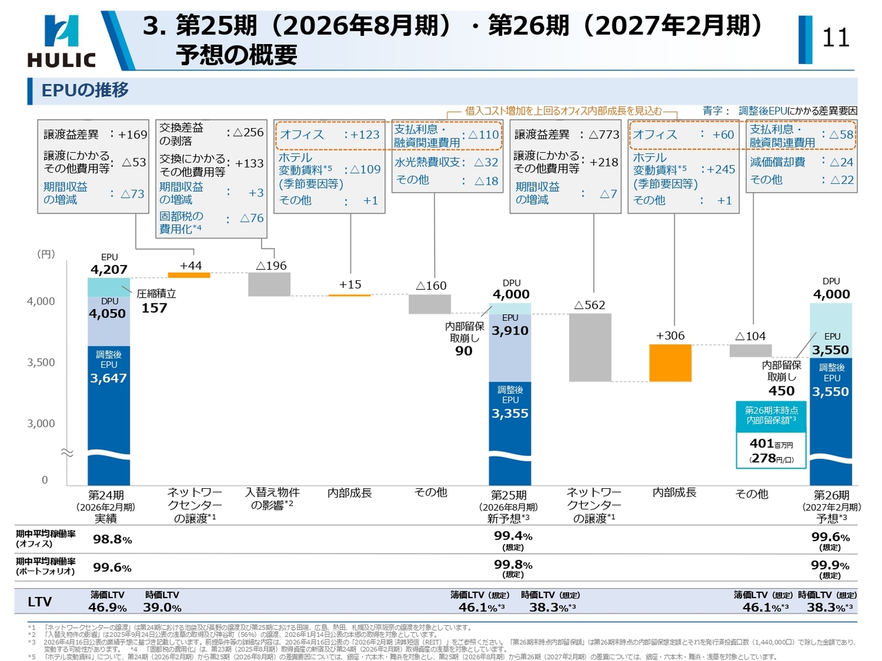 第26期も、金利上昇要因のマイナス58円は、オフィスの内部成長60円によりカバーする想定で、ホテルの季節要因や浅草の一部リニューアル効果等による変動賃料の増加により、調整後EPUは3,550円に増加する見込みです。