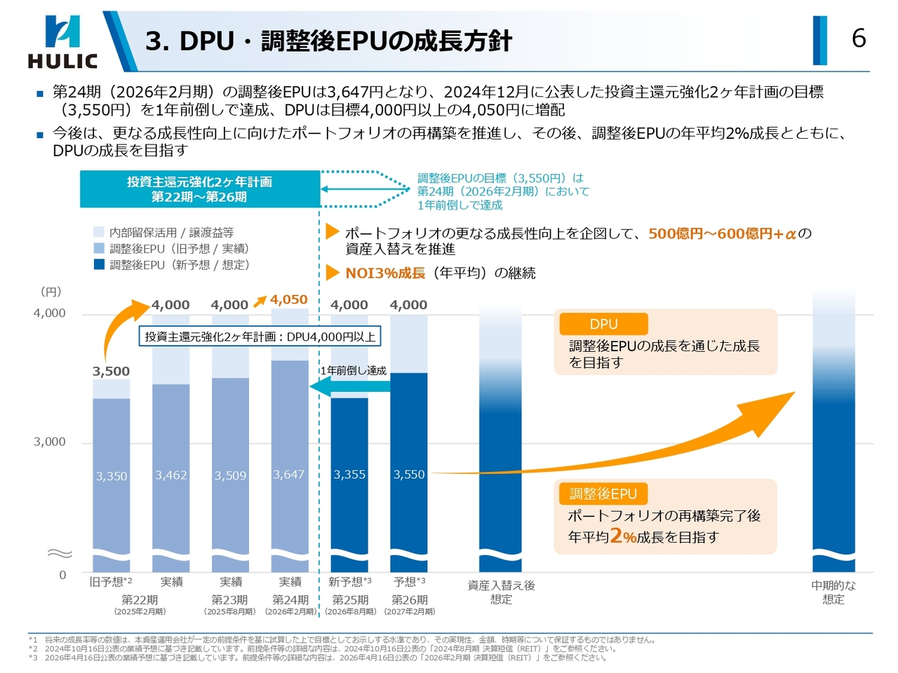 投資主還元強化2ヶ年計画については、調整後EPUが順調に増大し第24期実績で3,647円となり、第26期目標3,550円を1年前倒しで達成しました。これに伴い、DPUも目標4,000円以上としてきましたが、今回4,050円に増配としました。