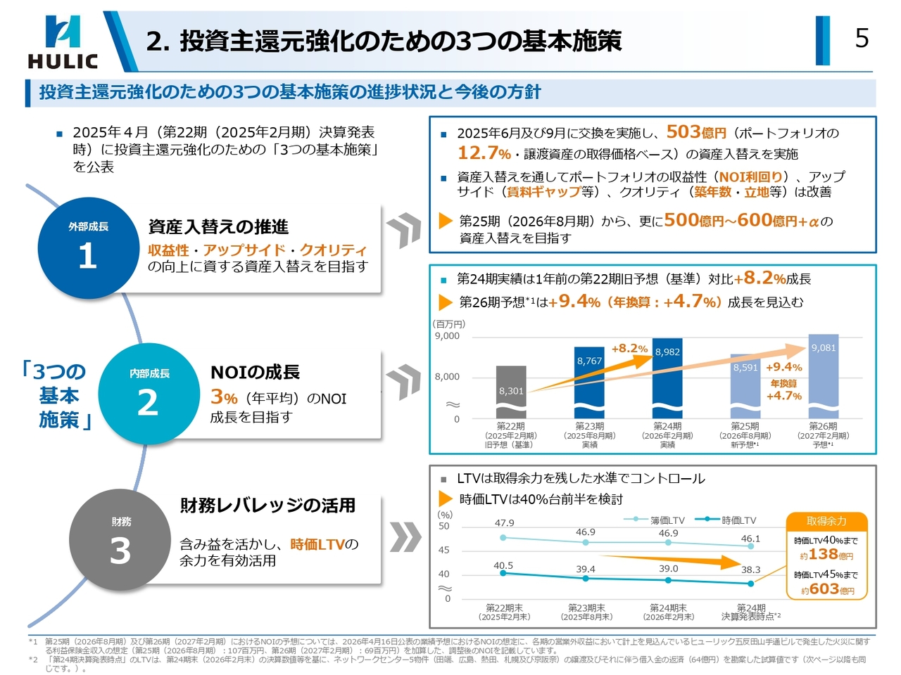まずは「3つの基本施策」でお示しした、当面500億円から600億円の資産入替えを推進しつつ、内部成長と財務レバレッジの活用も含めNOI年率3パーセント成長を継続していく想定です。