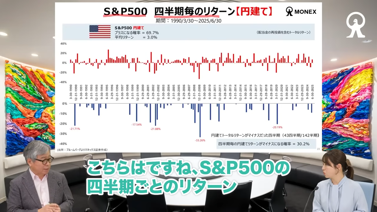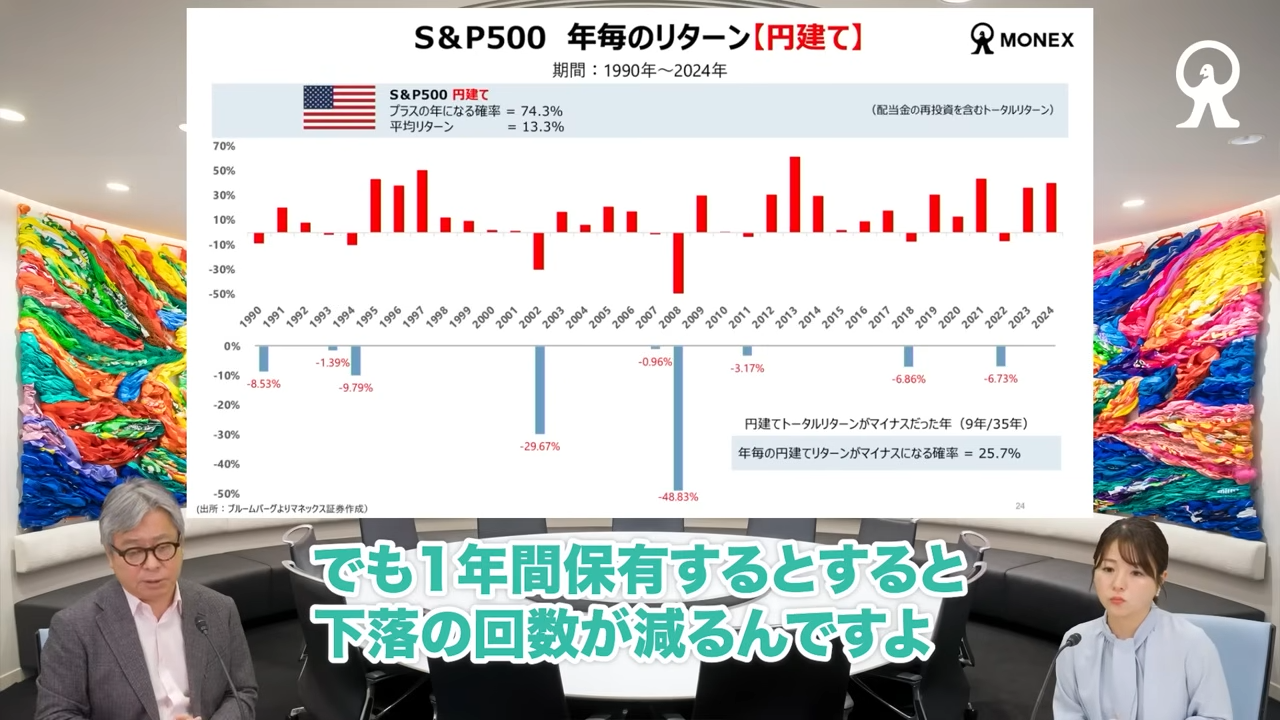 岡元:しかし、1年間保有すると、下落の回数は減少します。S&P500を3ヶ月保有した場合、マイナスになる確率は30パーセントですが、1年間保有すると25.7パーセントに下がります。