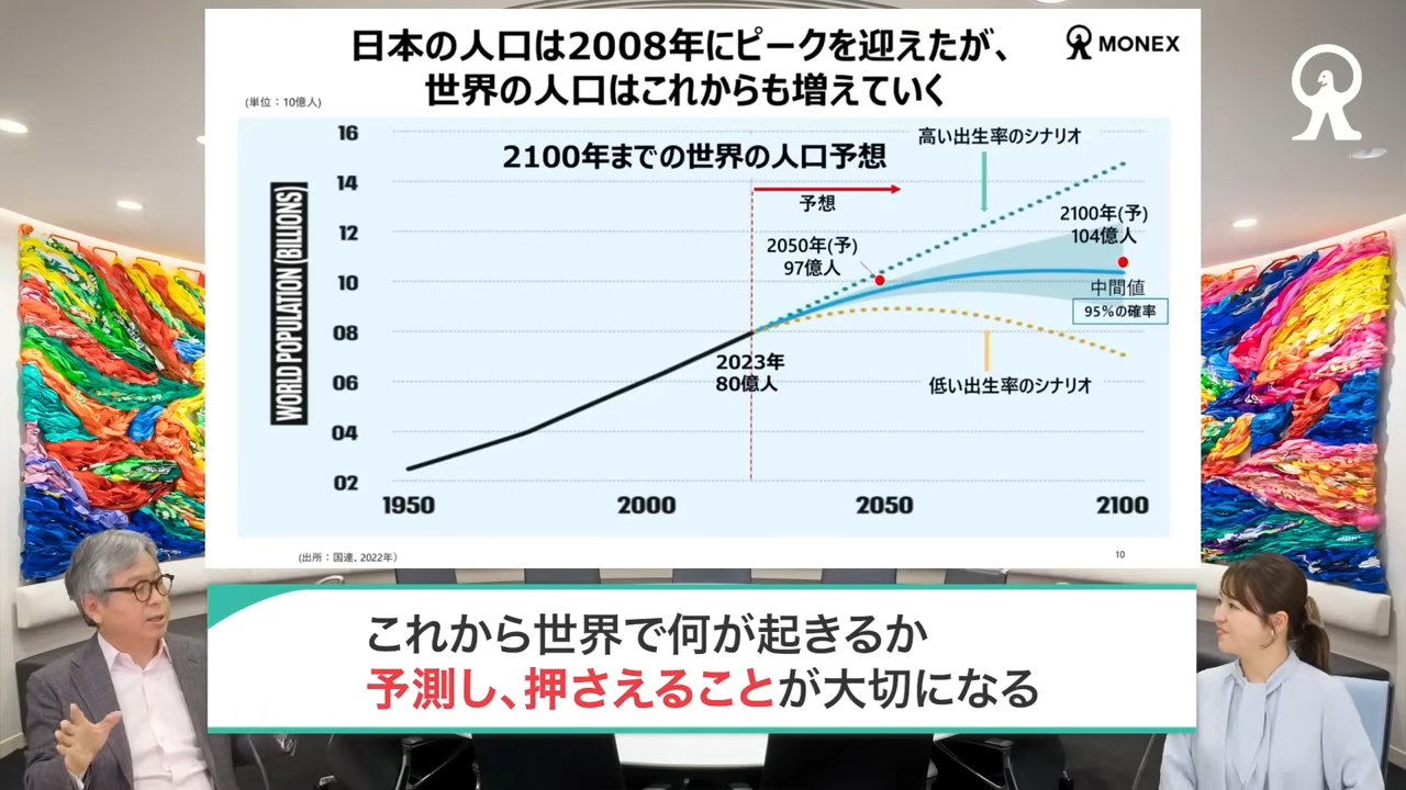 例えば、日本の人口は減っていますが、世界の人口は増えています。世の中の流れとして、今は80億人を超えて100億人に向かっています。